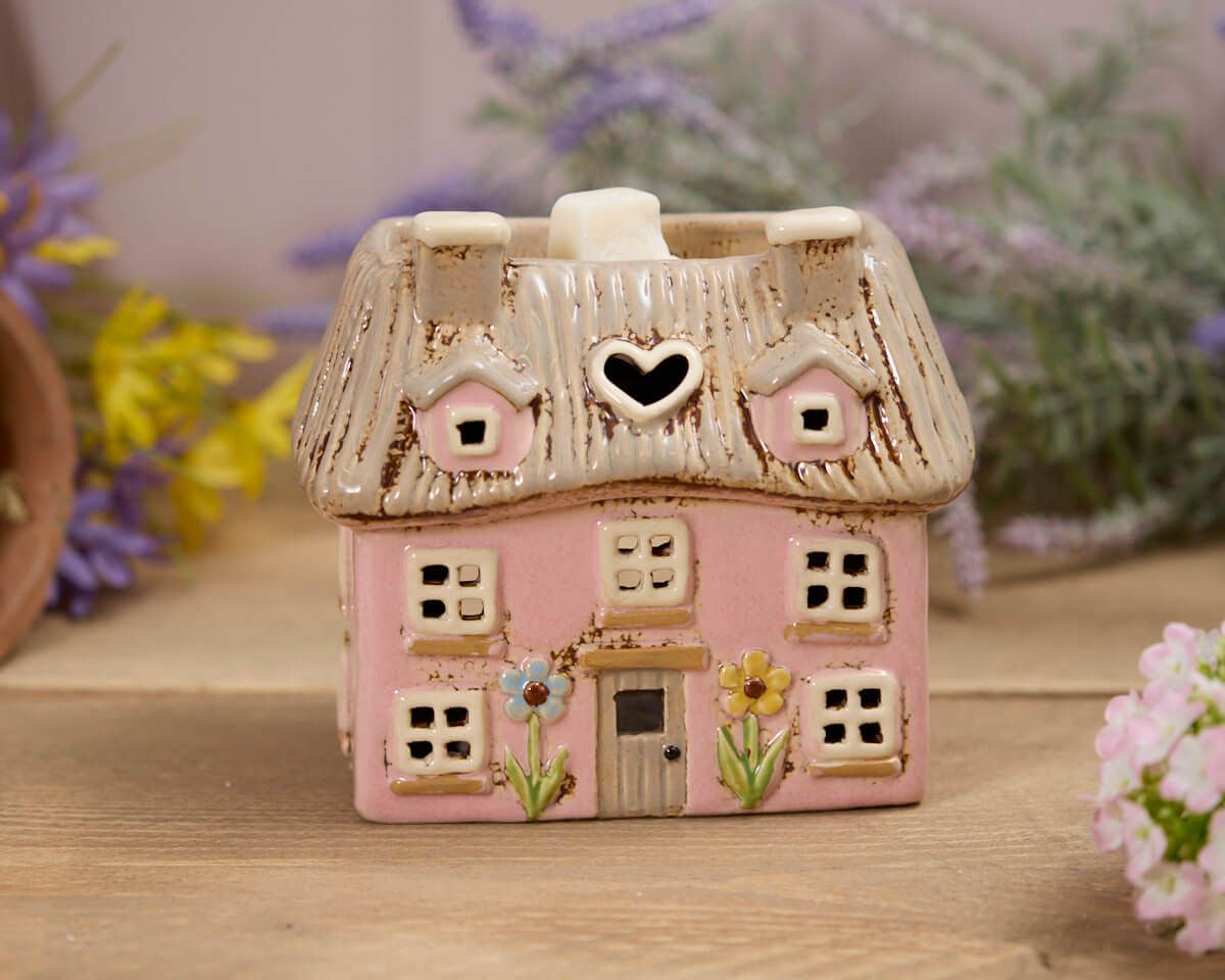 Ever so sweet Wax melter and ever so perfect as an ornament when not in use a a burner two pretty flowers at the door and it even has a cute little heart window in the roof.