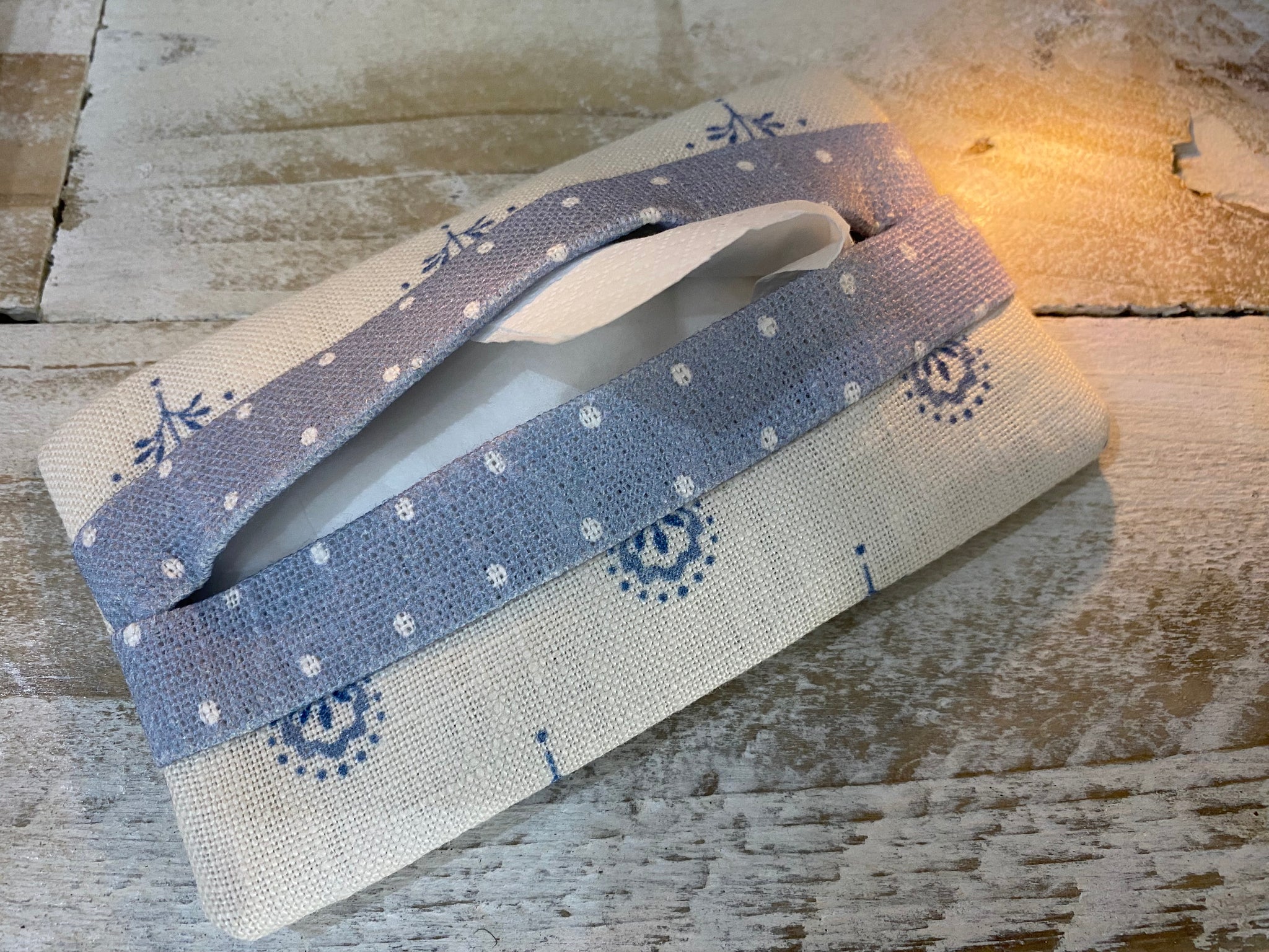 Pocket Tissue cover made in Peony & Sages Ottillie in Blue with a blue and white spotty linen lining.